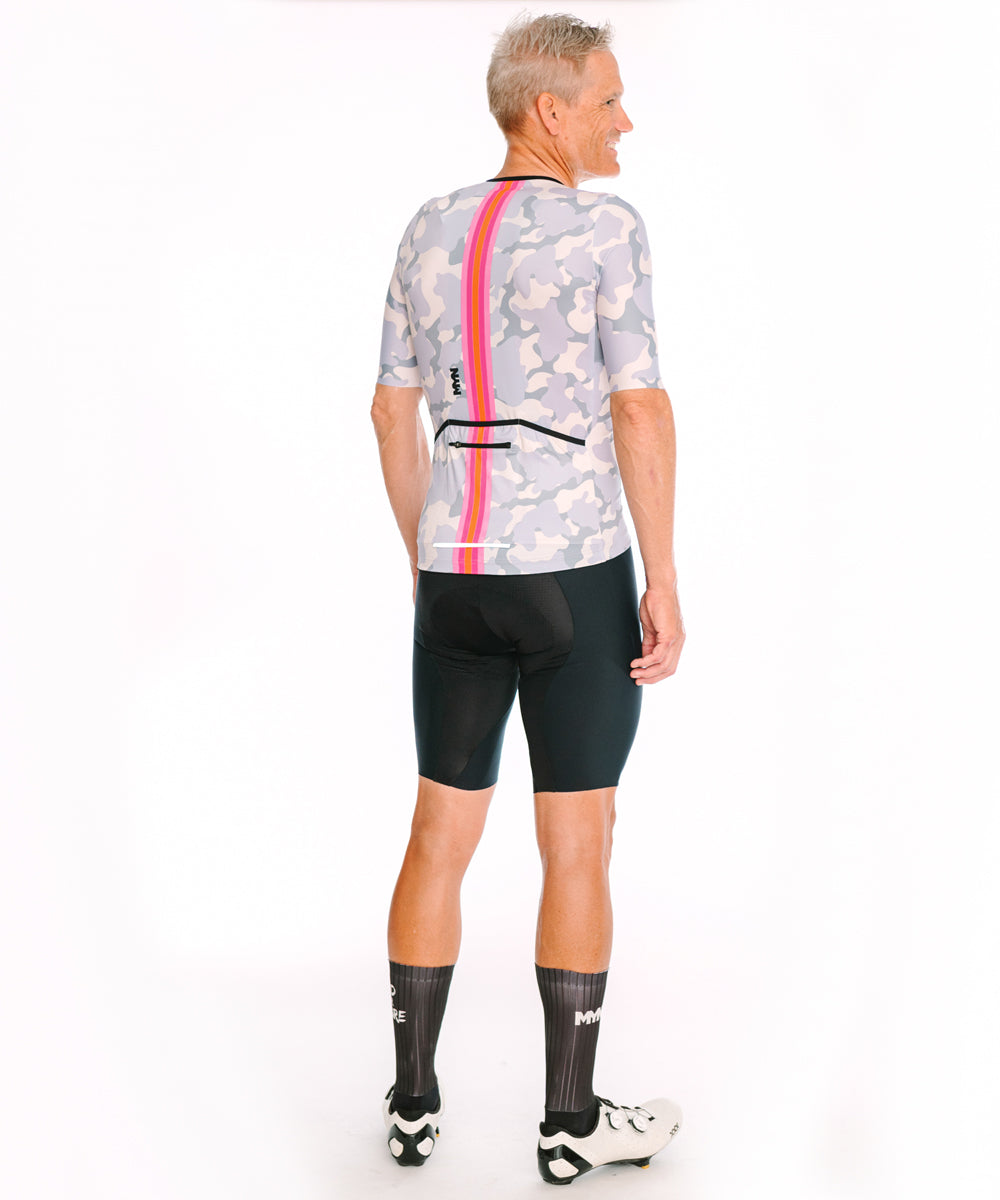 MASK short sleeve cycling jersey. It's made of quick-drying, lightweight material that adapts to the body shape for a race fit. Light fabric front for increased ventilation with an open mesh back. Full front zipper and four rear pockets, one with zipper.