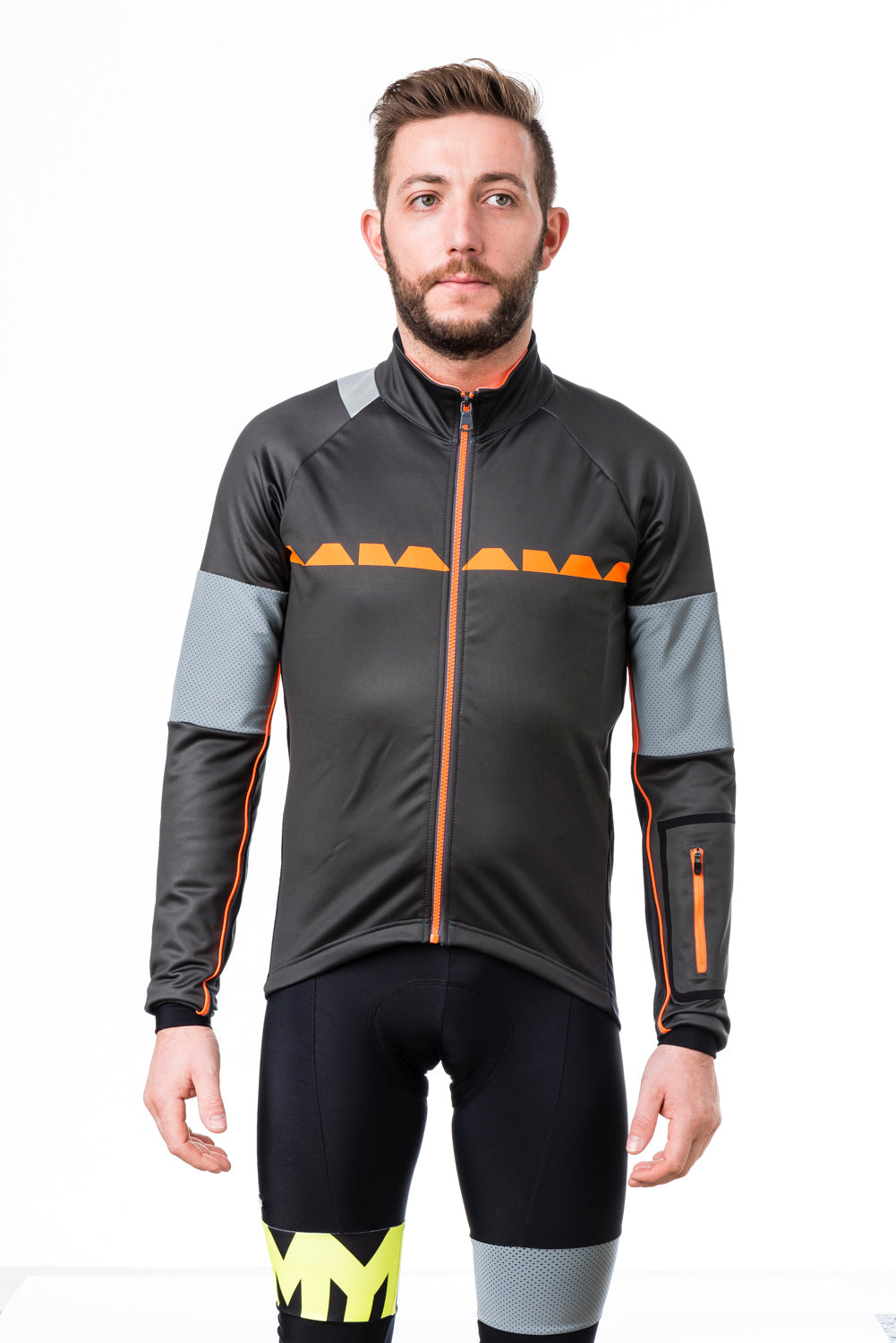 Winter jacket with fleece wind-resistant membrane. Zip in contrast color, high neck with covered zip. High tech reflective, yet elastic, material around the left arm, back and neck maximizes safety and visibility. Large thermo-bonded pocket on the forearm with contrast zip. Three rear pockets and rubber elastic waste band.100% Made in Italy.